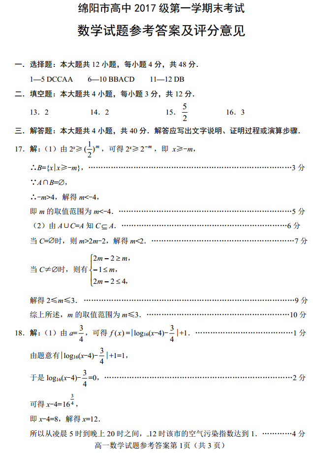 绵阳市2017级高一第一学期末考数学试题答案