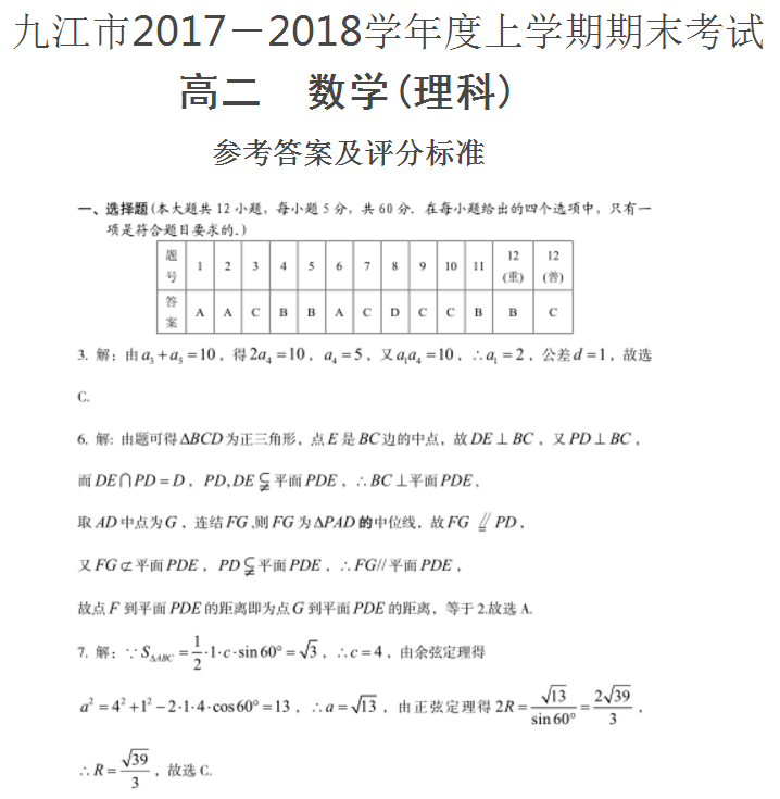 九江市2017-2018学年上期期末考试高二数学理科试题答案