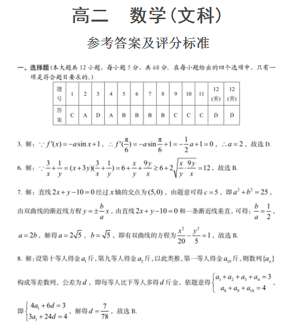 九江市2017-2018学年上期期末考试高二数学文科试题答案