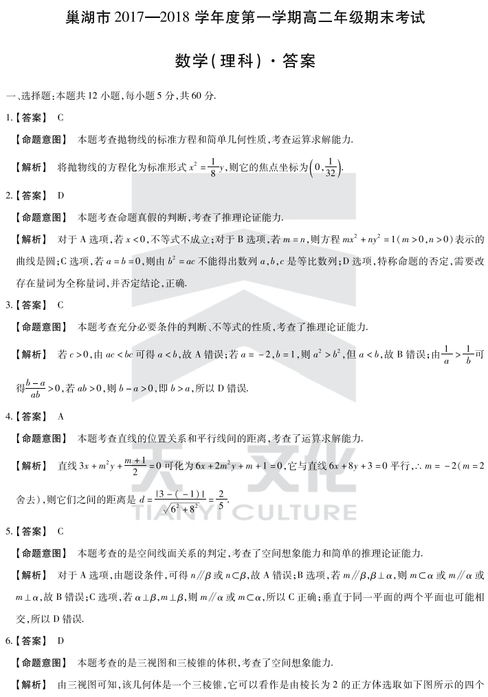 巢湖2017-2018学年度第一学期高二期末考试数学理科试题答案