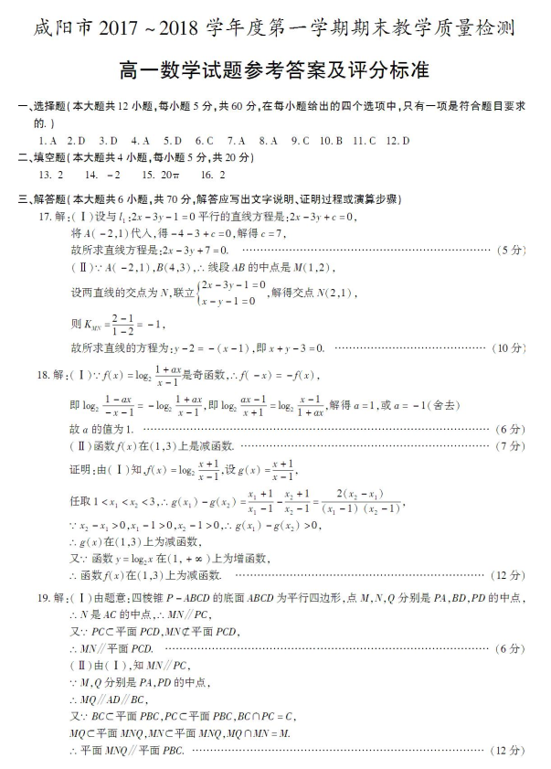 咸阳市2017-2018学年度第一学期高一期末质检数学试题答案