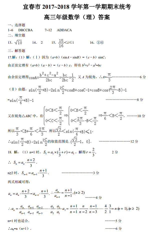 宜春2017-2018学年第一学期期末统考高三数学理科试题答案