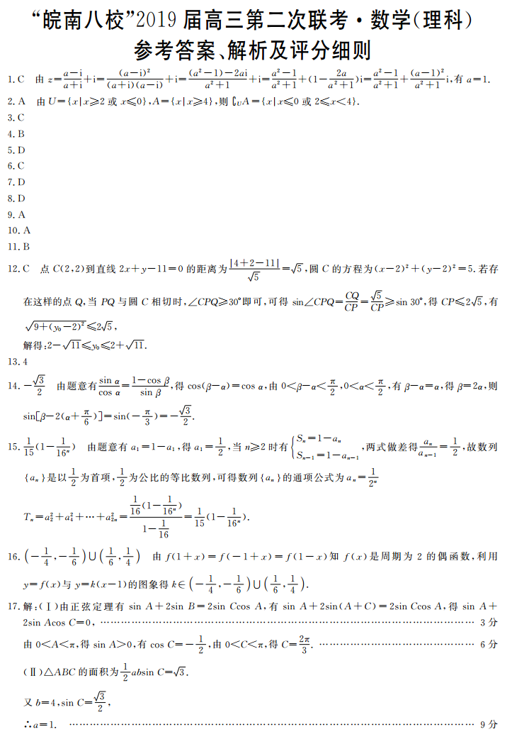 皖南八校2019届高三第二次联考理科数学试题答案