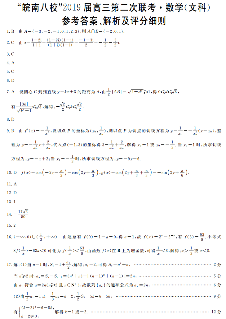 皖南八校2019届高三第二次联考文科数学试题答案