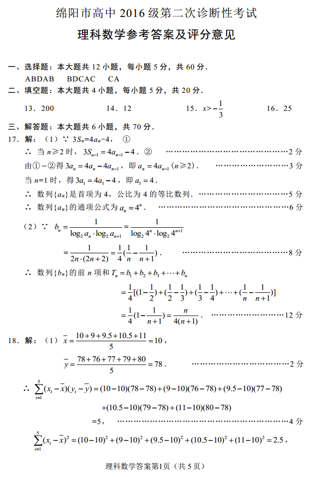 2019绵阳二诊数学 绵阳市2019年高三第二次诊断性考试数学理科试题答案