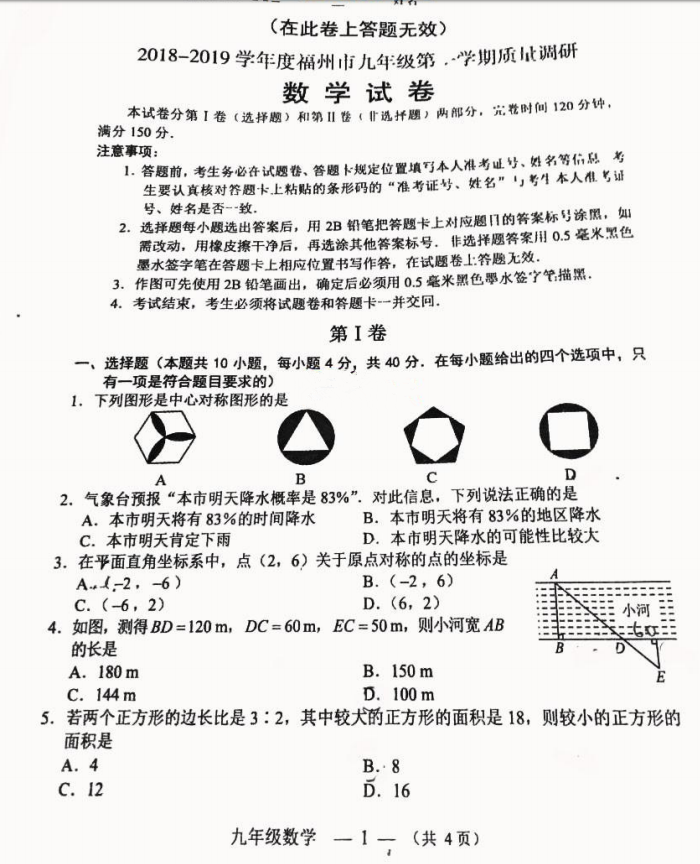 福州市2018-2019学年第一学期九年级期末质量检测数学试题答案