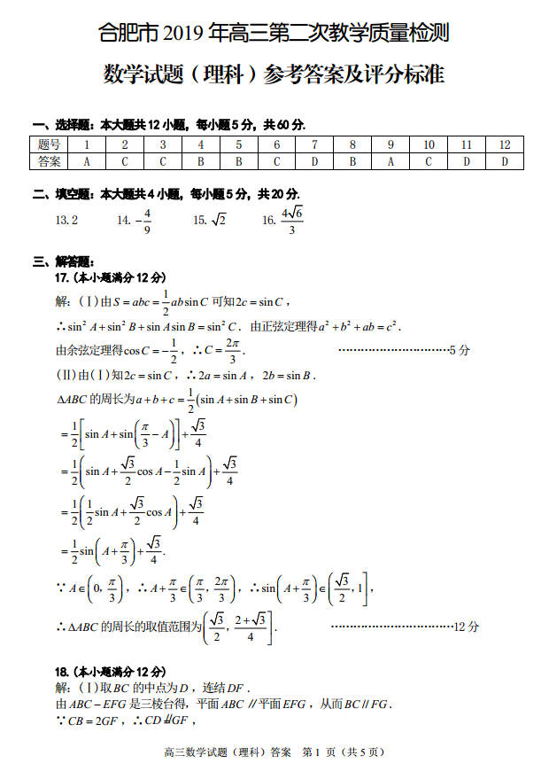 合肥市2019年高三第二次教学质量检测数学理科试题答案