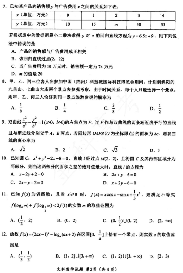 2020年绵阳二诊数学文科试题及答案(2)