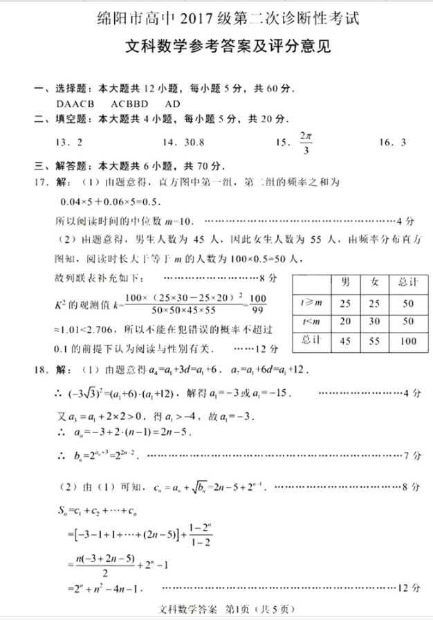 2020年绵阳二诊数学文科试题及答案(5)