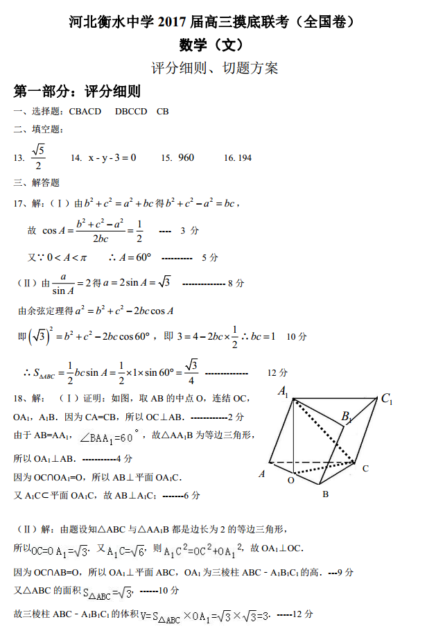 河北衡水中学2017届高三摸底联考全国卷数学文科试题答案