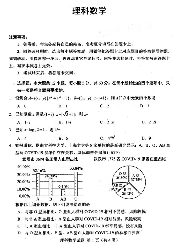 2020年绵阳三诊数学理科试题及答案
