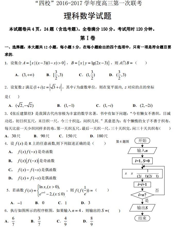 广东湛江一中四校2017届高三上学期第一次联考数学理科试题答案