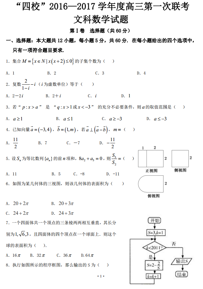 广东湛江一中四校2017届高三上学期第一次联考数学文科试题答案