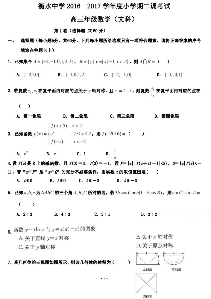 河北衡水中学2017届高三上学期小二调考试数学文科试题答案