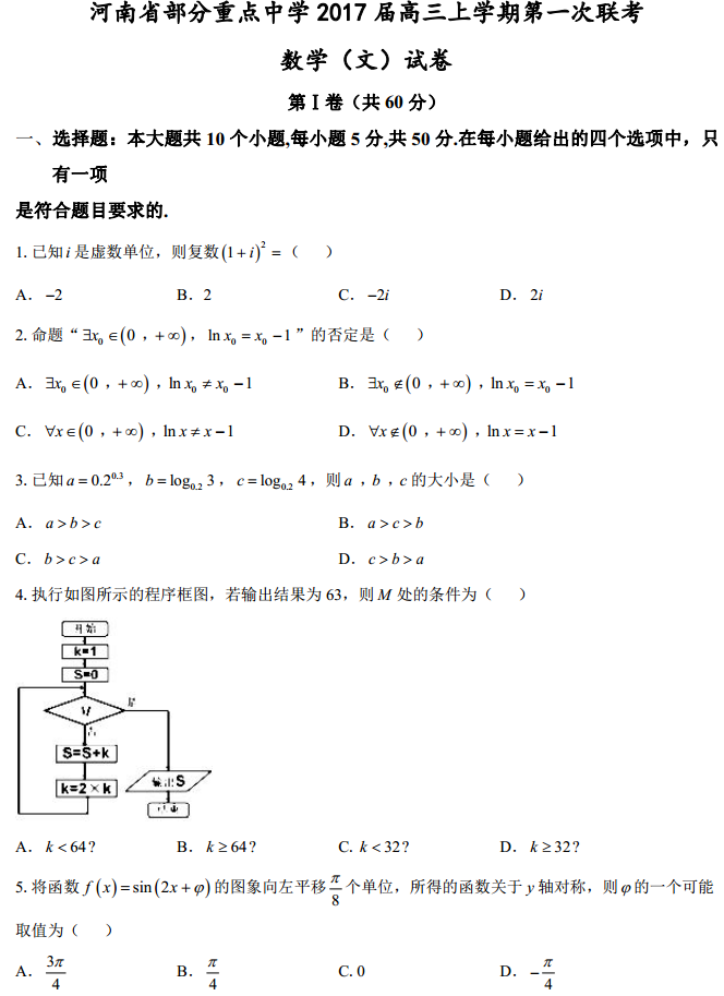 河南部分重点中学2017届高三上学期第一次联考数学文科试题及答案