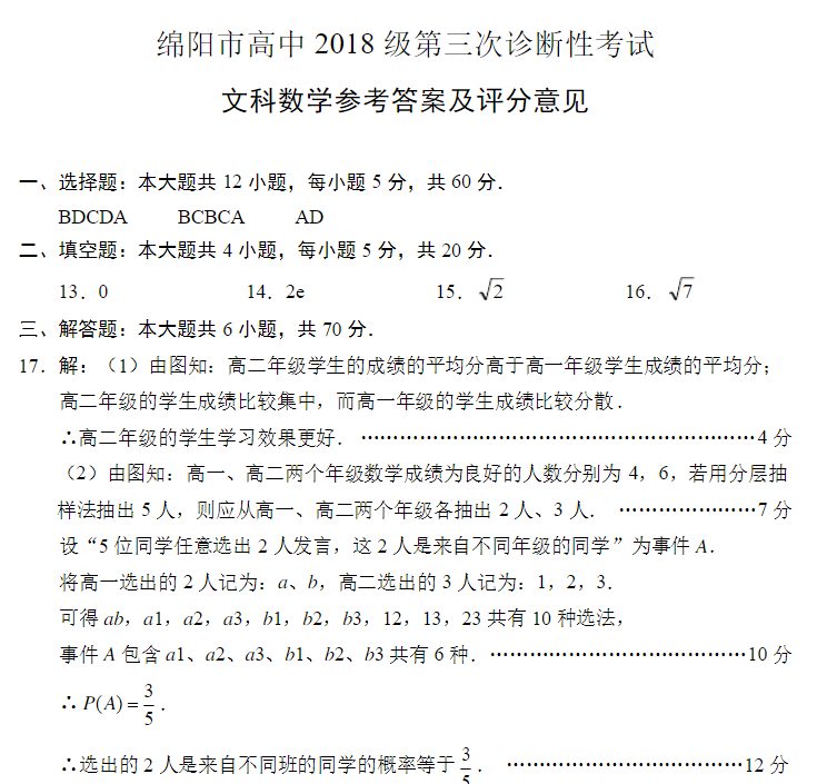 2021年绵阳三诊数学文科试题及答案(5)