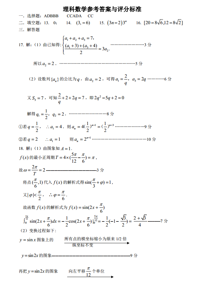 2016年10月河北保定高三摸底考试理科数学试题答案