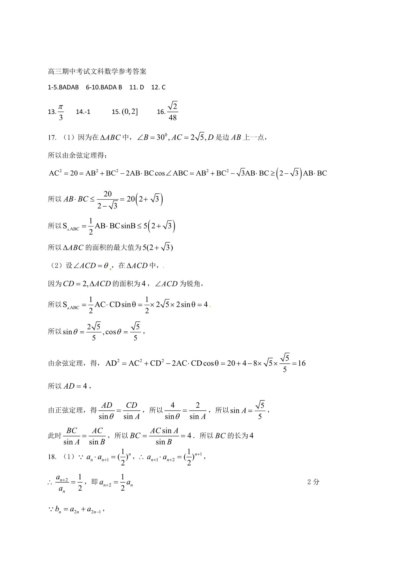 河北衡水中学2016-2017学年高三上期中考数学文科试题及答案(7)