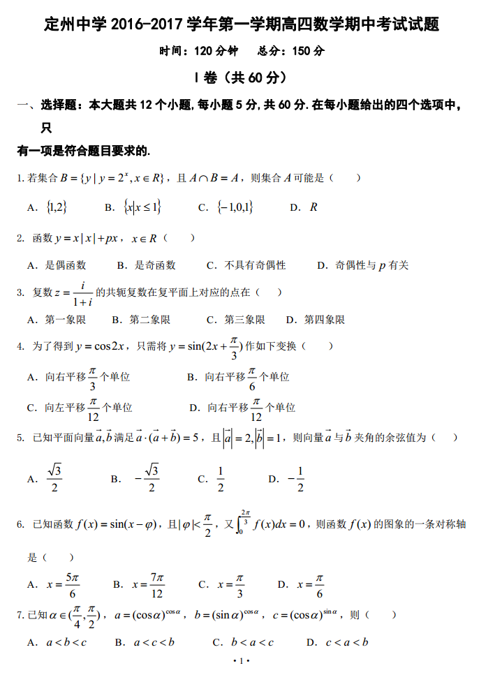 河北定州中学2017届高四上期期中考试数学试题及答案