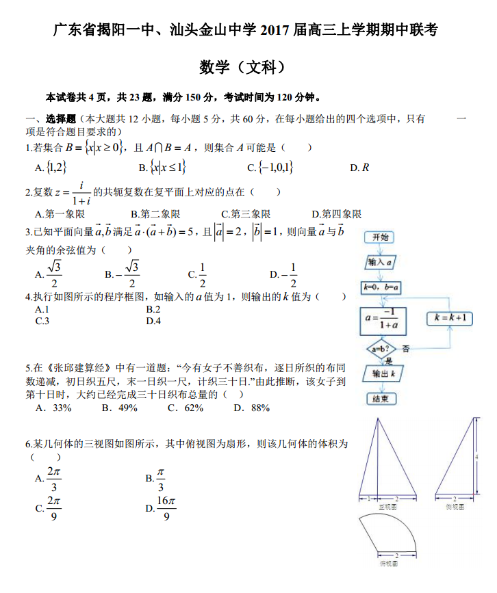 广东揭阳汕一中汕头金山2017届高三上期中联考数学文科试题及答案