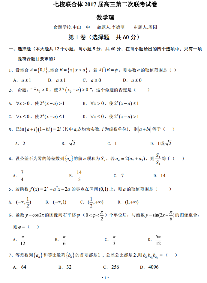 广东七校联合体2017届高三上期第二次联考数学理科试题及答案