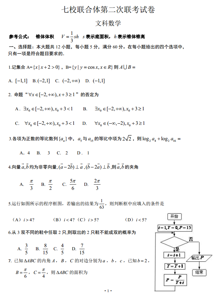 广东七校联合体2017届高三上期第二次联考数学文科试题及答案