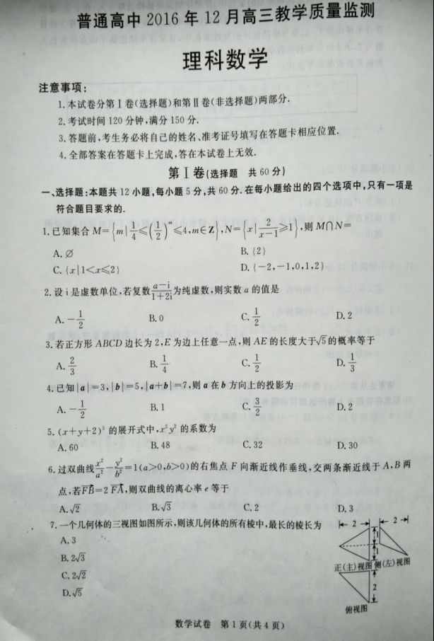 河北沧州2017届高三12月教学质量监测数学理科试题及答案