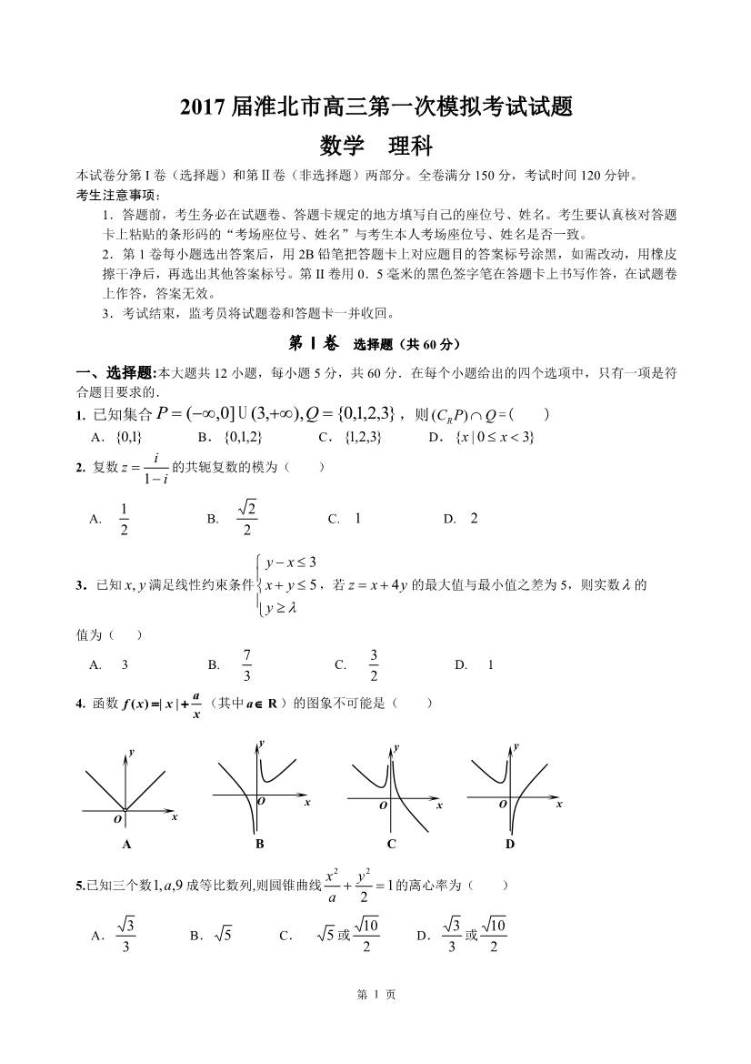 2017淮北一模高三数学理科试题及答案