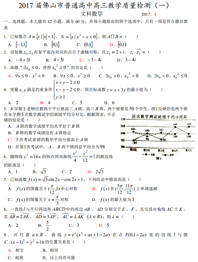 广东汕头2017届高三上学期期末质量监测数学文科试题及答案