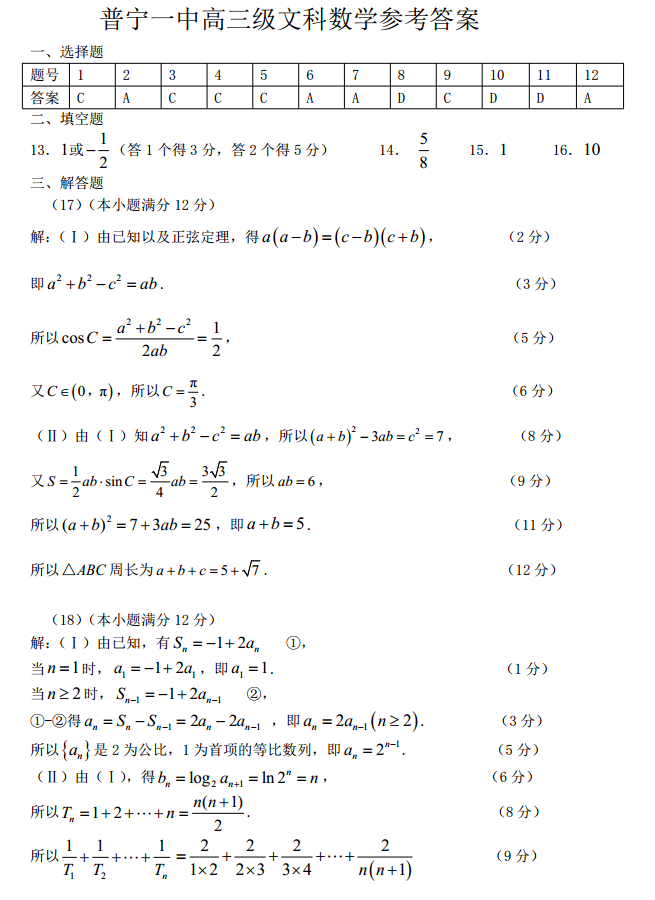 广东普宁一中2016-2017学年高三期末考数学文科试题及答案(5)