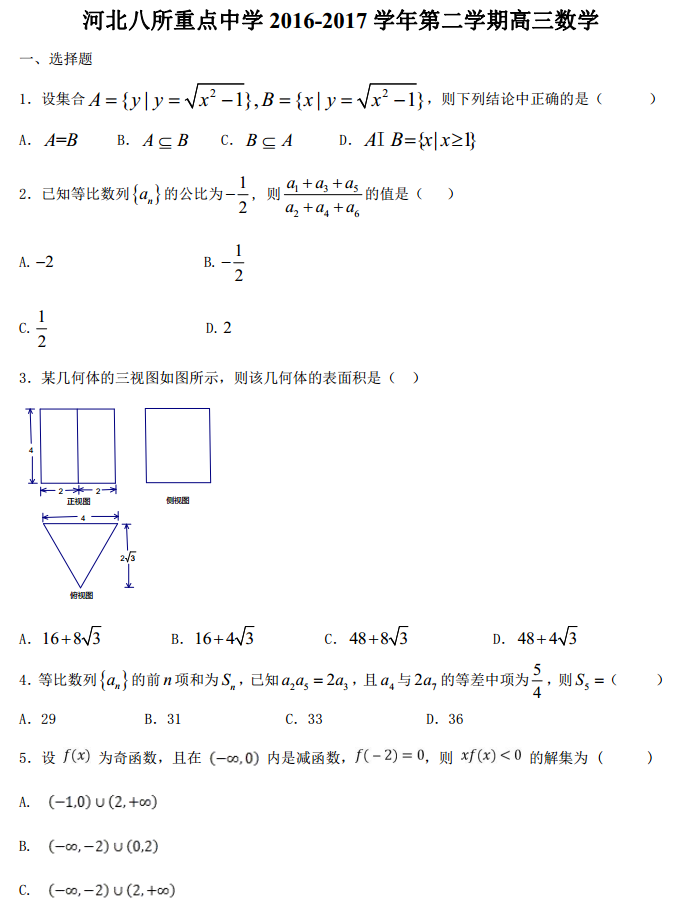 河北八所重点中学2017届高三第二学期第一次联考数学试题及答案