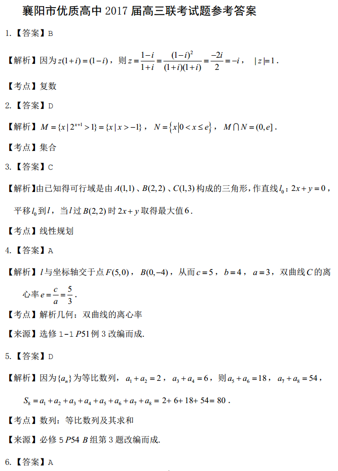 湖北襄阳优质高中2017届高三1月联考数学文科试题及答案(6)