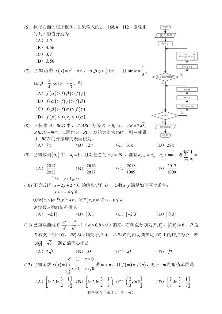 2017福州高三质检数学 福州高三毕业班质量检测数学理科试题及答(2)