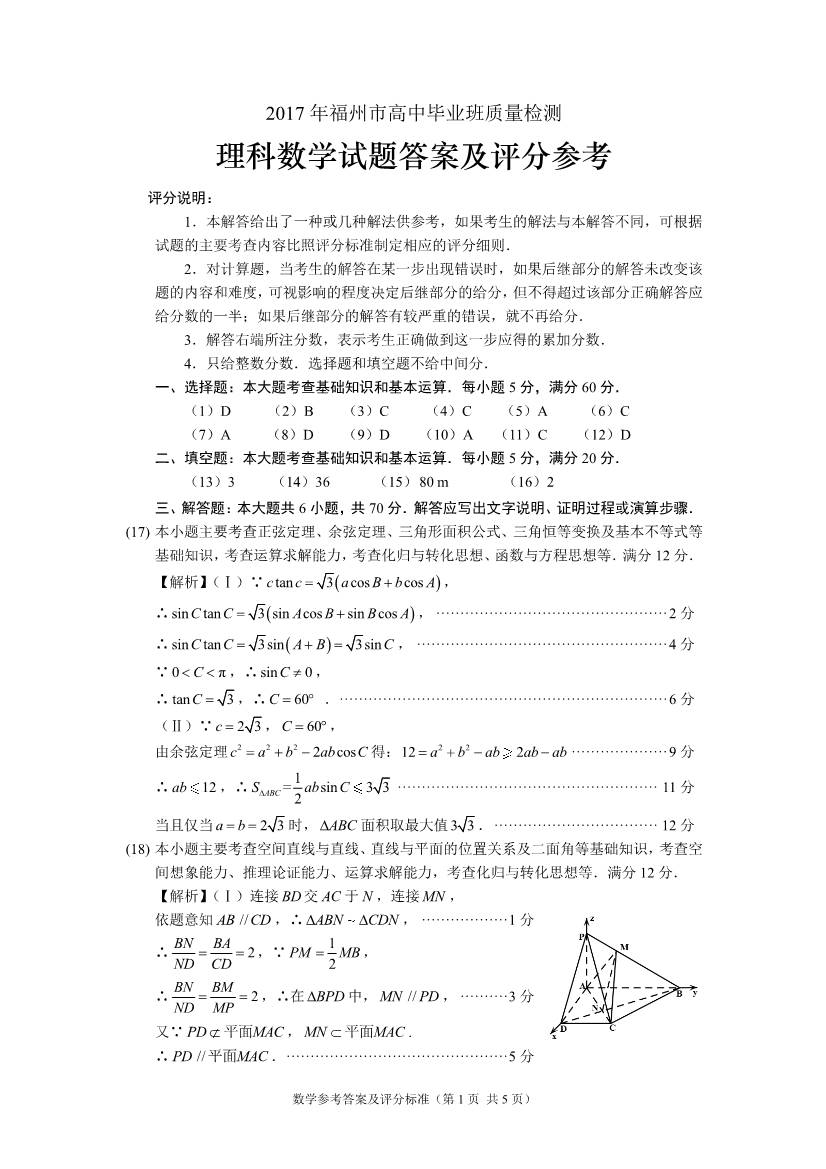 2017福州高三质检数学 福州高三毕业班质量检测数学理科试题及答(5)