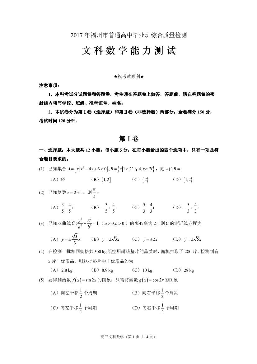 2017福州高三质检数学 福州高三毕业班质量检测数学文科试题及答