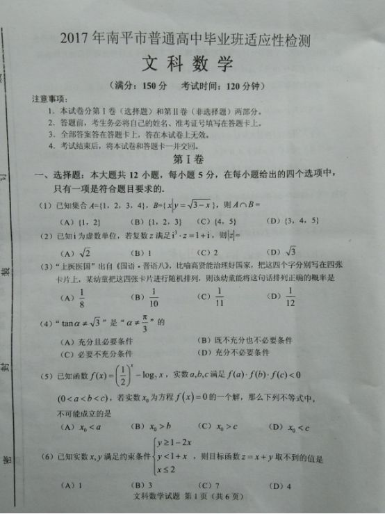 2017年3月南平高三质检数学 南平高三适应性检测数学文科试题及答