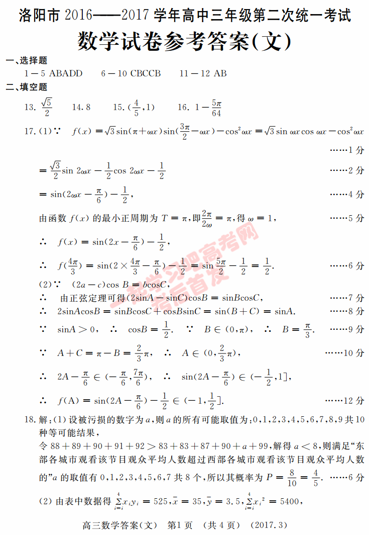 2017年洛阳二练数学答案 2017洛阳二练数学文科试题及答案