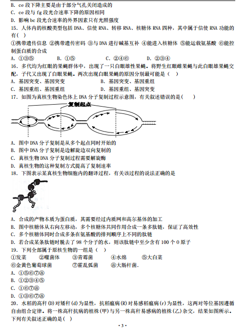 2016湖北枣庄第七中学高三下学期中考理综生物试题及答案(3)