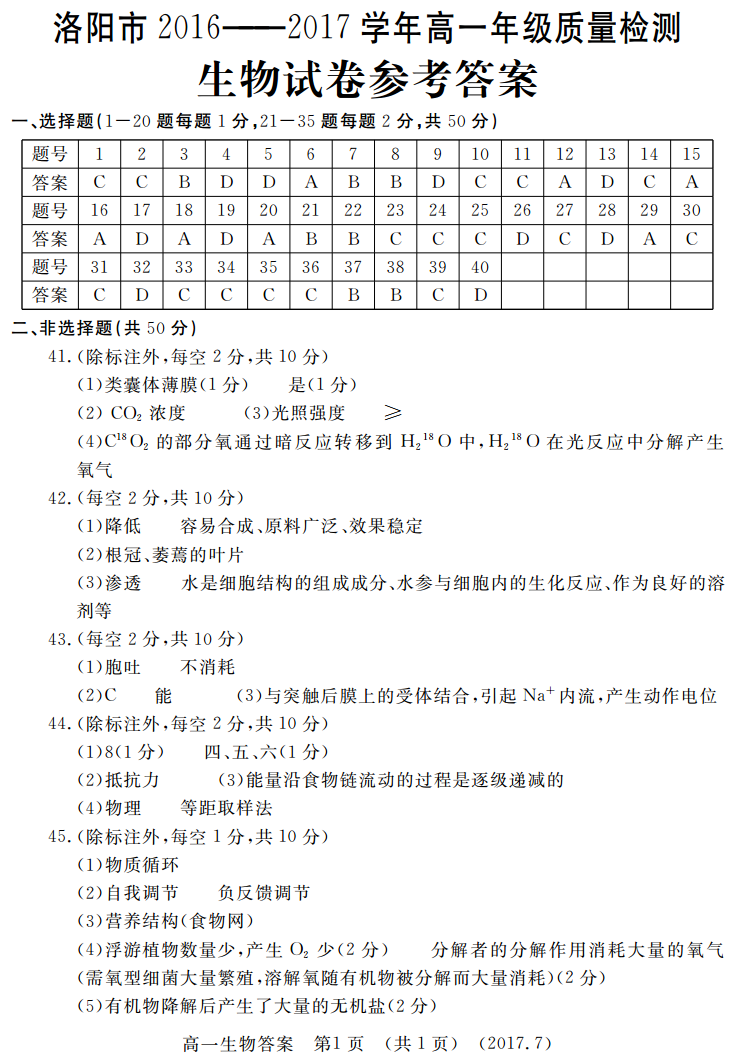 洛阳市2016-2017学年高一年级质量检测生物试题答案