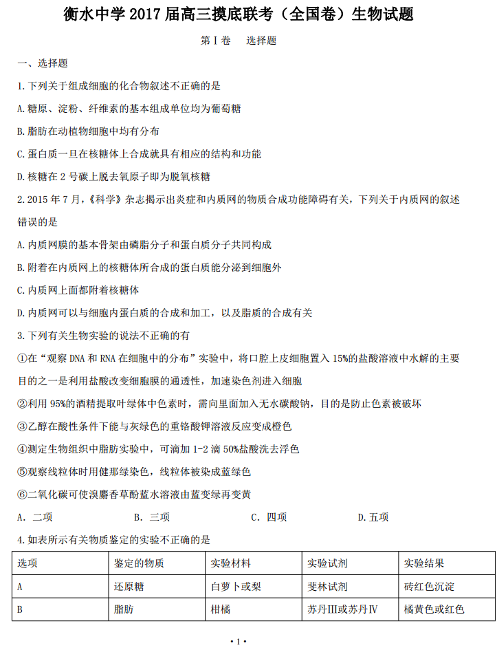 河北衡水中学2017届高三摸底联考理综生物试题及答案