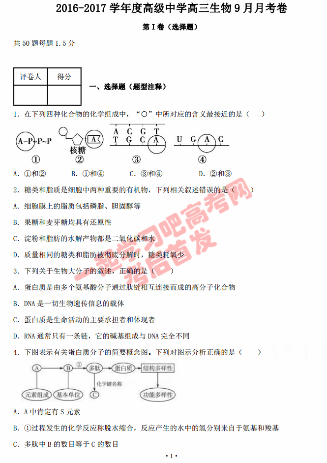 河北故城县高级中学2017届高三上期第一次月考生物试题答案