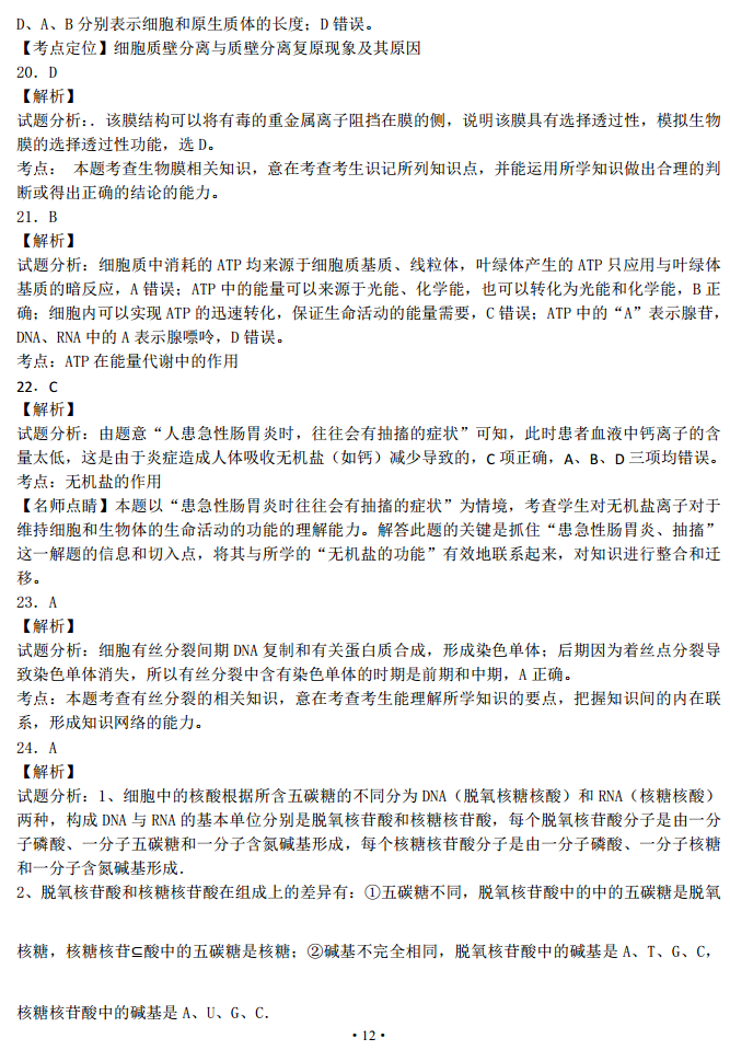 湖北枣阳鹿头中学2017届高三上学期9月月考生物试题答案(12)