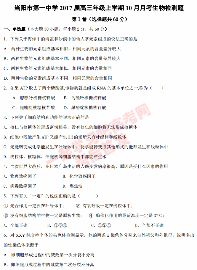 湖北当阳第一中学2017届高三10月月考生物试题及答案