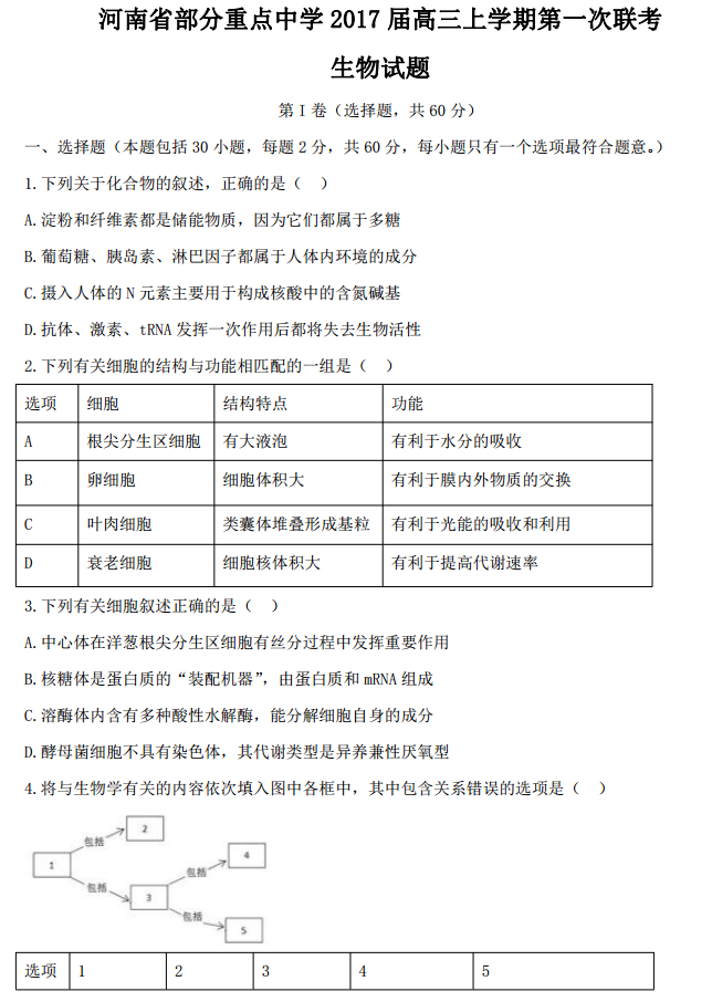 河南部分重点中学2017届高三上学期第一次联考生物试题及答案