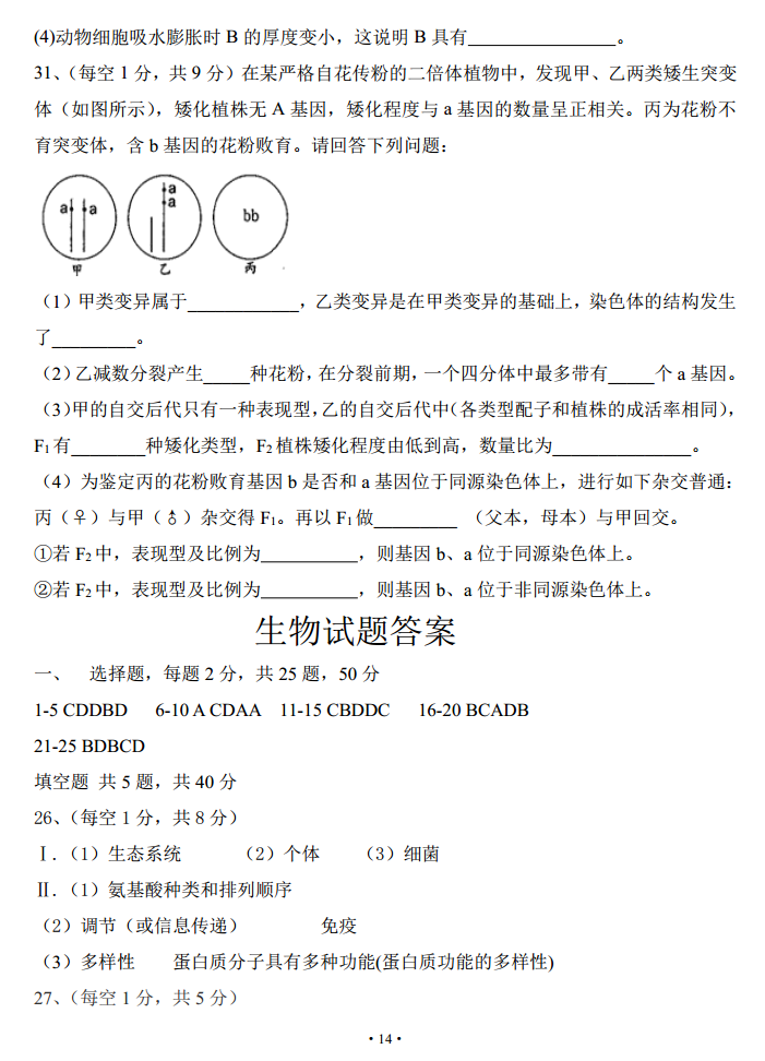 河北承德市2017届高三上学期期中考试生物试题及答案(14)