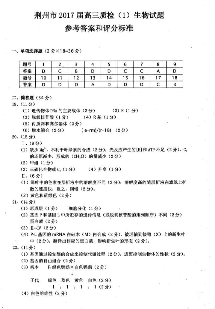 湖北荆州2017届高三上期第一次质检生物试题及答案(9)