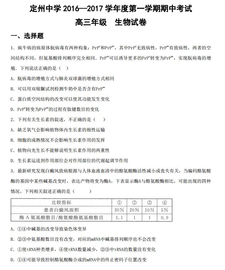 河北定州中学2017届高三上期期中考生物试题及答案