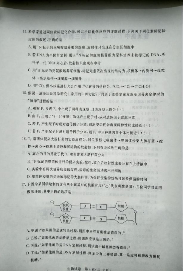 河北沧州2017届高三12月教学质量监测生物试题及答案(4)