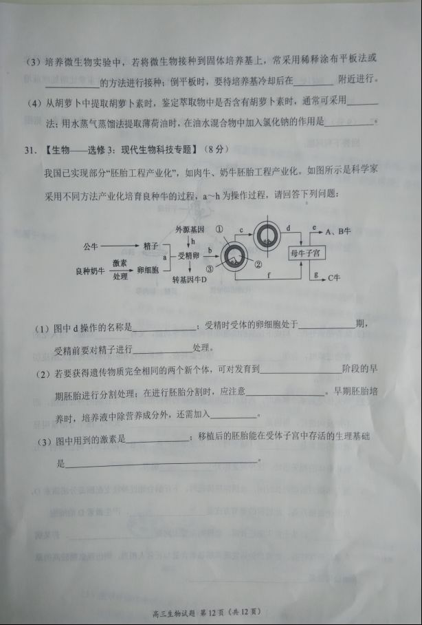 豫南九校2016-2017学年上期期末质量考评高三生物试题及答案(12)