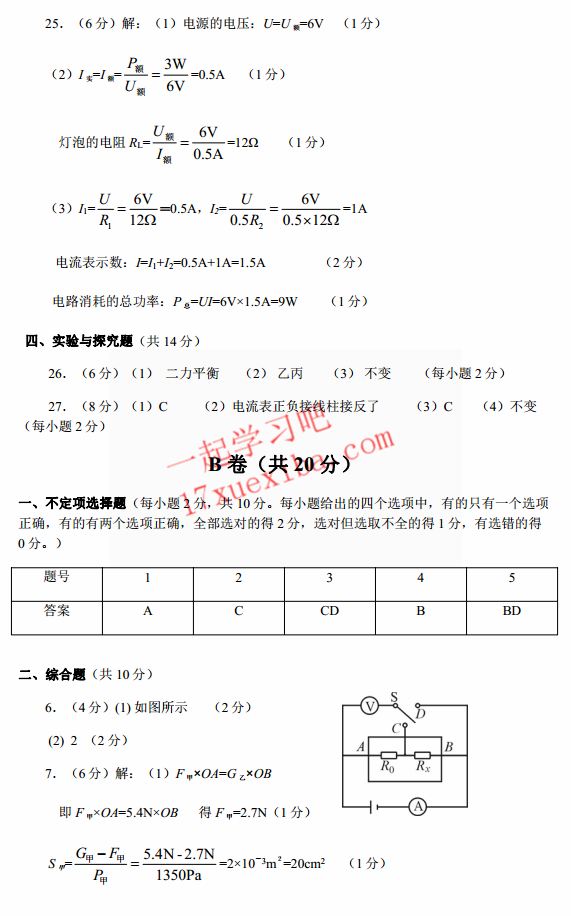 彭州市2017年初三诊断性考试物理试题答案(2)
